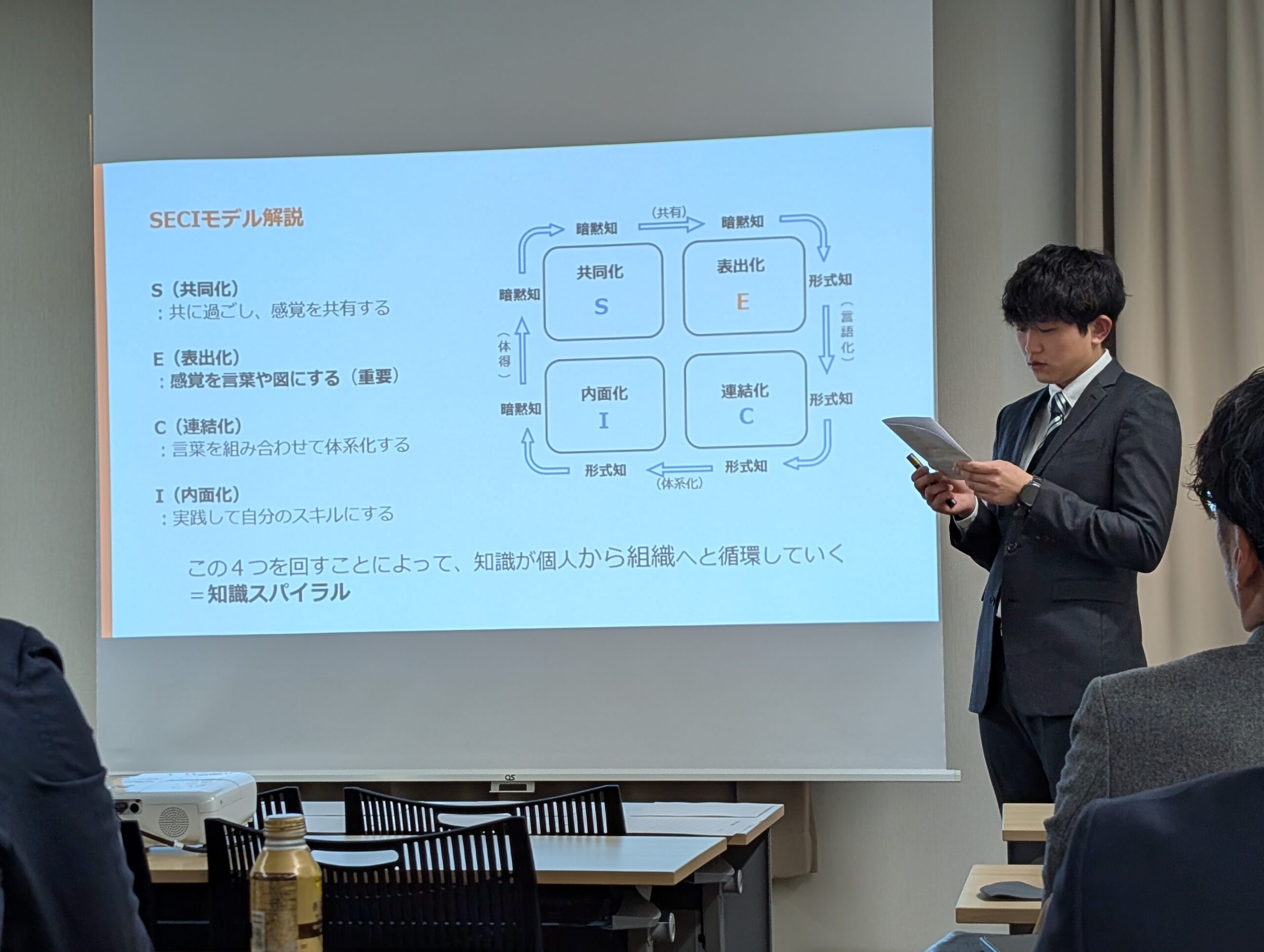前半の座学では、知識の扱いを整理する枠組みとしてSECIモデルに触れながら、マニュアル化(連結化)
